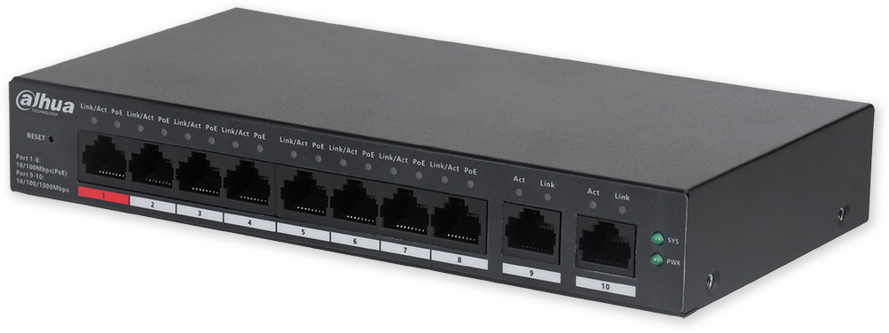 Popis portů: 8 x PoE 10/100 Mbps, 2 x RJ45 uplink 10/100/1000 Mbps