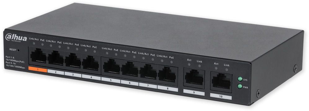 Popis portů: 8 x PoE 10/100 Mbps, 2 x uplink 10/100/1000 Mbps