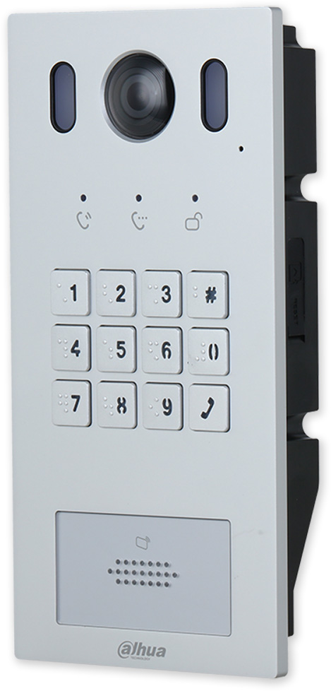 Venkovní IP jednotka pro RJ-45 nebo 2 drátovou instalaci s přímou tlačítkovou volbou pomocí kódové klávesnice. Komunikace po SIP protokolu. Obsahuje kameru, kódovou klávesnici, čtečku karet, IR LED přisvícení, reproduktor, mikrofon a 1x relé pro ovládání dveřního zámku.