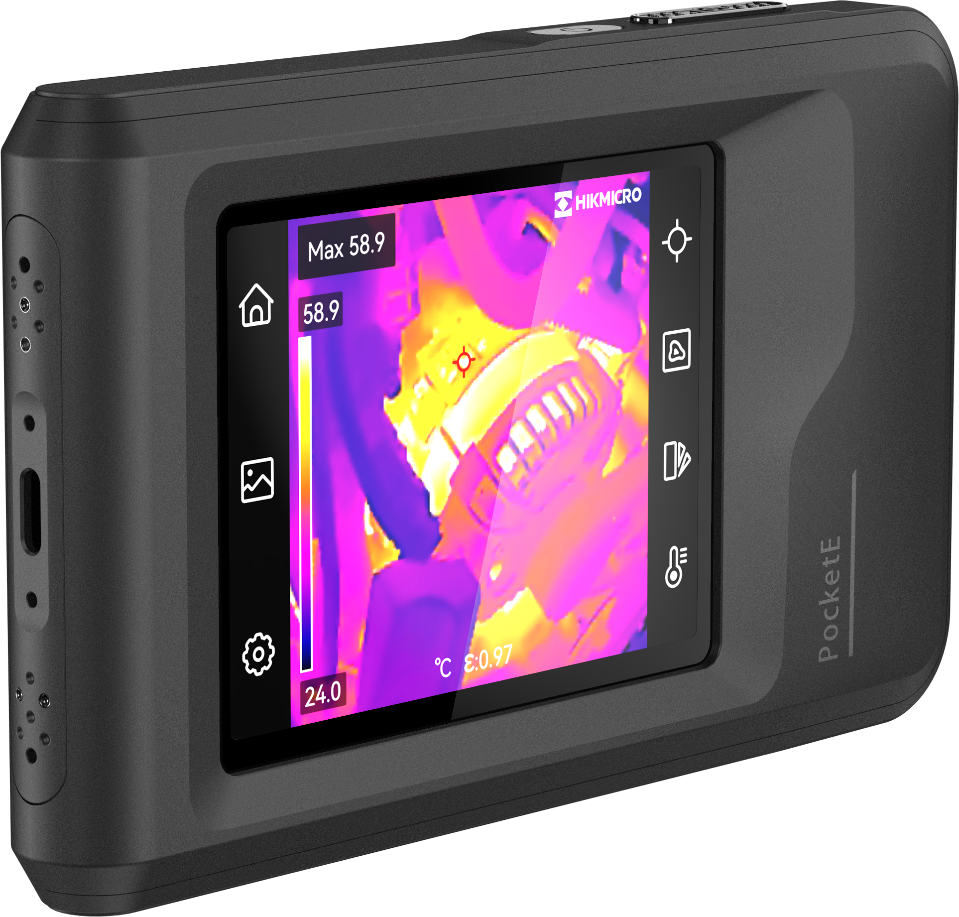 Ruční termografická kamera, rozsah měření teploty -20 až +350°C, rozlišení senzoru 96 x 96 Pixel, optika 50° x 50°, geometrické rozlišení (IFOV) 8,89mrad, displej 3,5 dotykový", rozlišení displeje 320 x 240 Pixel, přesnost měření 2°C, minimální zaostřovací vzdálenost 0,1m, zabudovaná LED žárovka, teplotní citlivost 50mK, rozhraní USB-C, Wi-FI, výdrž baterie 4 hodin, nabíjení přes USB-C cca 2,5 hodiny, Vnitřní paměť: 4Gb, rozměry: 138.45 × 85.2 × 23.6 mm, hmotnost: 218g.
