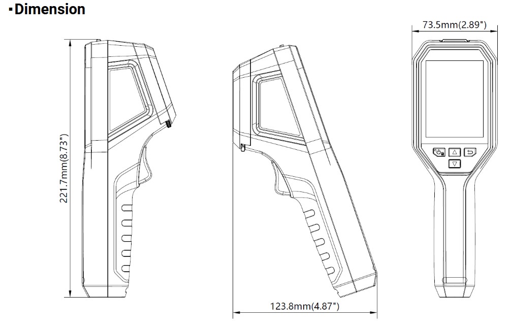 Ruční termografická kamera, rozsah měření teploty -20 až +550°C, rozlišení senzoru 256 x 192 Pixel, optika 37.2° x 50°, geometrické rozlišení (IFOV) 3.33mrad, displej 3.2", rozlišení displeje 240 x 320 Pixel, přesnost měření 2°C, minimální zaostřovací vzdálenost 0,3m, teplotní citlivost 40mK, rozhraní Wi-Fi/USB-C, výdrž baterie 6 hodin, nabíjení přes USB-C cca 3 hodiny, vnitřní paměť: 16Gb, rozměry: 221.7 mm × 73.5 mm × 123.8 mm, hmotnost: 380g.