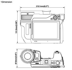 Ruční termografická kamera, rozsah měření teploty -20 až +650°C, rozlišení senzoru 640 x 480 Pixel, optika 8° × 6°, geometrické rozlišení (IFOV) 0.22 mrad, displej 5", rozlišení displeje 1280x720 Pixel, digitální zoom 12x, dotykový displej, přesnost měření 2°C, minimální zaostřovací vzdálenost 2m, teplotní citlivost <30mK, rozhraní Wi-Fi/Bluetooth/USB-C/HDMI-D, výdrž baterie 4 hodin, nabíjení přes USB-C cca 2,5 hodiny, rozměry: 204.7 × 153.6 × 87.8 mm , hmotnost: 1481g.