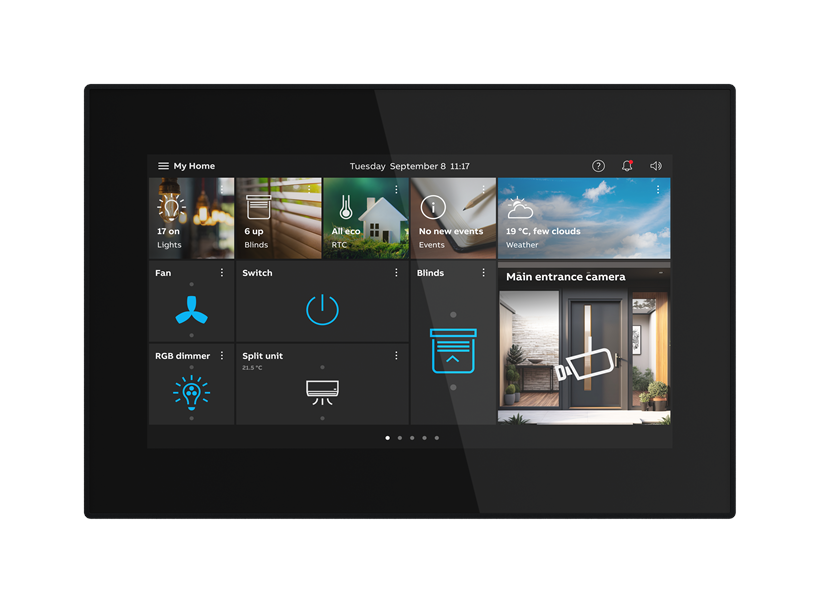 Centrální ovládací dotykový panel se 7palcovým IPS displejem s rozlišením 1024x600, který v sobě kombinuje ovládání chytrého domu a dveřní komunikaci v jednom zařízení. OneTouch 7" nabízí ovládání a monitorování systému ABB-free@home (flex + bezsběrnicový tedy wireless) a plně integrované funkce ABB-Welcome Midi (2drátová technologie).
