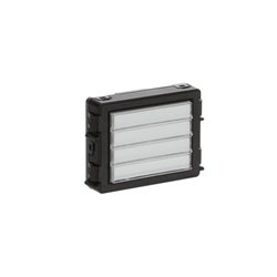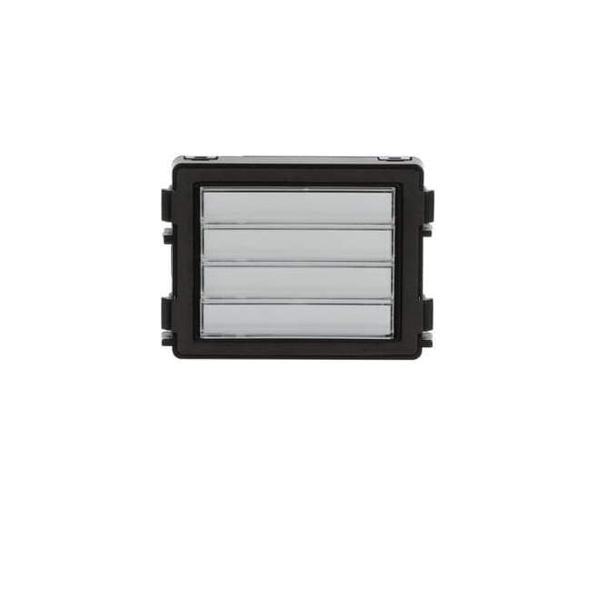 4 tlačítka pro volání vnitřních stanic. Možnost nastavení jednoduchého nebo dvojitého režimu tlačítek na hlasovém modulu. Podsvícení v režimu den/noc. Rozměry (v × š × h): 72 × 97 × 25 mm Stupeň krytí: IP 54 Pracovní teploty: –40 až +55 °C *135 mm ... Modernizovaná platforma s menší vestavnou hloubkou funkčních modulů. Modul je kompatibilní s platformou 135 mm i s platformou 125 mm.