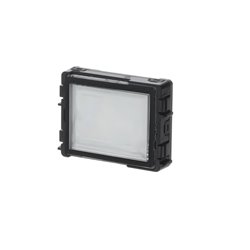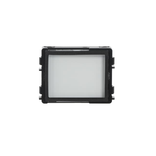 Modul informační. Pro umístění adresy nebo popisu budovy v tlačítkovém table. Slouží také jako záslepka pro zaplnění nevyužité pozice v tlačítkovém table. Podsvícení v režimu den/noc. Výměna štítku lze provést po demontáži horního krytu tabla.