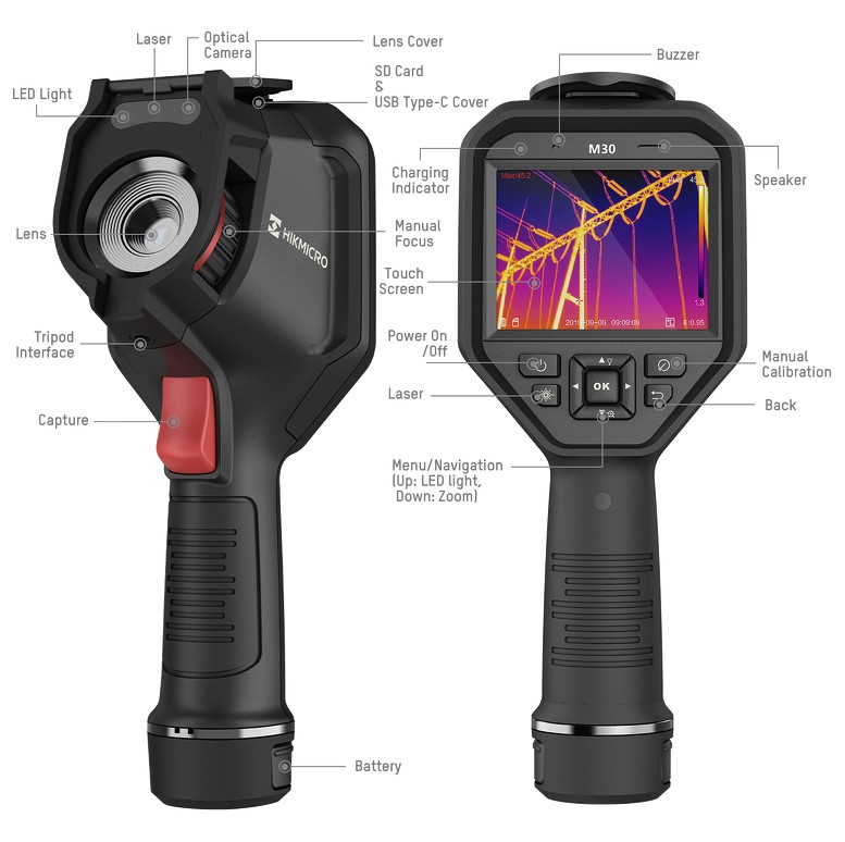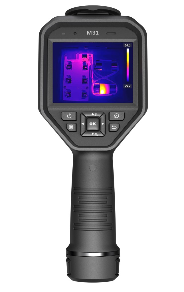 Ruční termografická kamera, rozsah měření teploty -20 až +650°C, rozlišení senzoru 384 x 288 Pixel(v režimu Super IR 786 x 576 Pixel) , optika 41° x 30.5°, geometrické rozlišení (IFOV) 1.87mrad, displej 3.5", rozlišení displeje 640 x 480 Pixel, digitální zoom 8x, dotykový displej, přesnost měření 2°C, minimální zaostřovací vzdálenost 0,1m, teplotní citlivost 35mK, rozhraní Wi-Fi/Bluetooth/USB-C, výdrž baterie 4 hodin, nabíjení přes nabíječku(součást balení) cca 4 hodiny, balení obsahuje: termokameru HICKMICRO M31, USB kabel, odolný kufr, řemínek na ruku, 2 ks Li-Ion akumulátory, napájecí adaptér, samostatnou nabíječku pro dva akumulátory, rozměry: 244 x 100 x 104 mm, hmotnost: 720g.