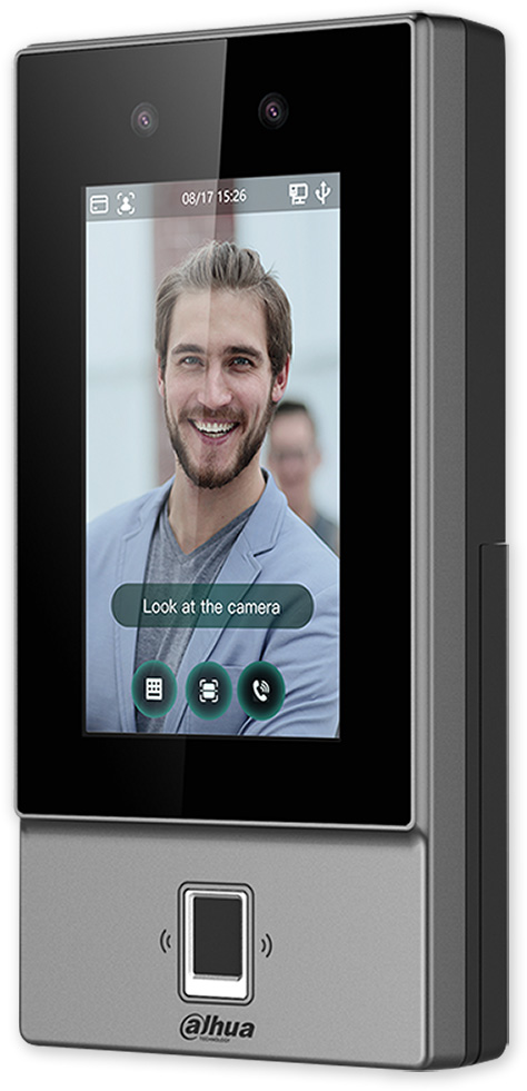 Řídící jednotka, dotykový displej 4.3", dual 2 Mpix kamera s IR. Vícenásobná metoda otevírání, obličej, otisk, IC karta, heslo. Podpora 6000 uživatelů, obličejů, hesel, otisků, 10 000 karet, 50 správců a 300 000 záznamů. Vysoká přesnost, zabezpečení, návštěvnické QR kódy, zvonek, videohovor, aplikace k přijímání oznámení, hlášení, odemykání a jiné. Připojení TCP/IP a Wi-Fi, napájení PoE, krytí IP65.