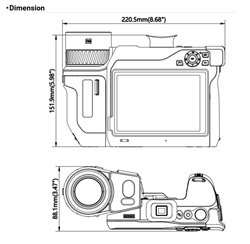 Ruční termografická kamera, rozsah měření teploty -40 až +2200°C, rozlišení senzoru 1280 x 1024 Pixel, optika 12° × 9,6°, geometrické rozlišení (IFOV) 0.17 mrad, displej 5.1", rozlišení displeje 1920x1080 Pixel, digitální zoom 12x, dotykový displej, přesnost měření 1°C, minimální zaostřovací vzdálenost 1,65m, teplotní citlivost <20mK, rozhraní Wi-Fi/Bluetooth/USB-C/HDMI-D, laser, GPS, kompas, výdrž baterie 4 hodiny, nabíjení přes USB-C cca 2,5 hodiny, rozměry: 221 × 152 × 88 mm , hmotnost: 1550g.