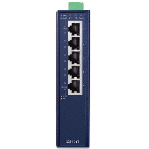 Průmyslový 5-portový switch 10/100/1000BASE-T, autodetekce rychlosti, kompaktní kovové provedení s krytím IP 30, vysoký teplotní rozsah, zemnící svorka.