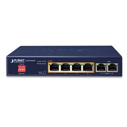 Switch 4x 10/100/1000T PoE + 2x 10/100/1000T, desktop provedení, celkový výkon až 65 W.