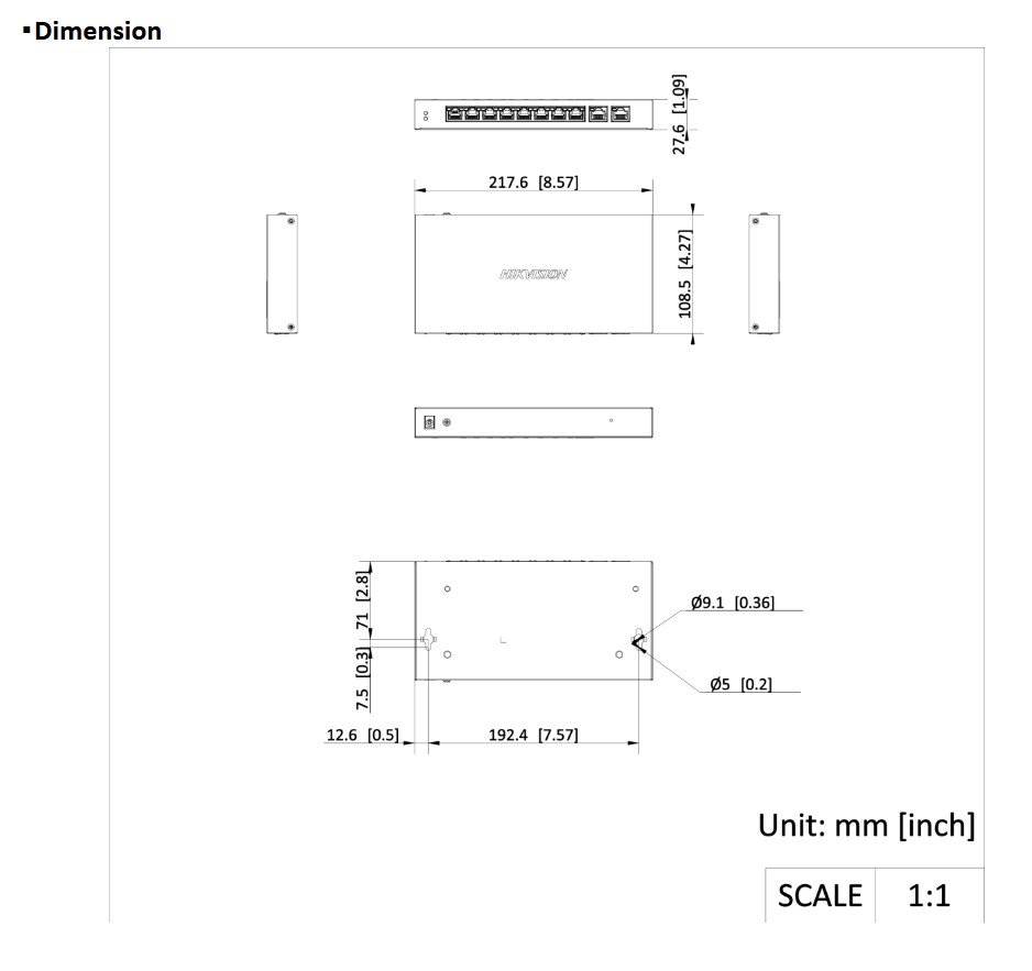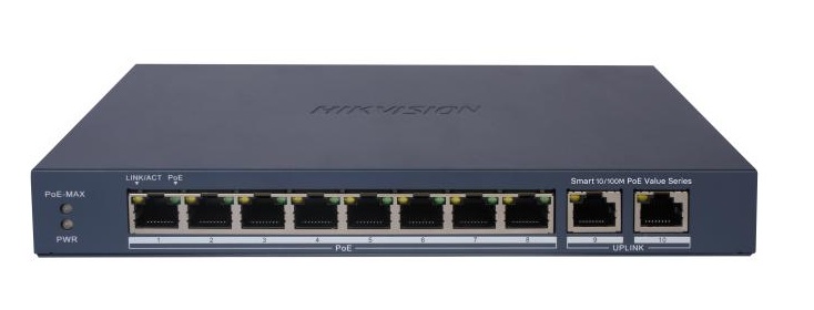 8 × 10/100 Mbps Hi-PoE (60W), 2x uplink port 10/100/1000Mbps, extend režim až na vzdálenost 300m, management přes webové rozhraní a Hik-Partner(vizualizace topologie sítě, alarmy typu PUSH, monitoring stavu zařízení v reálném čase, správa šířky pásma, náhled trasování, rozpoznávání zařízení, náhled živého snímku, restart portů), max. celkový výkon PoE 60 W, přepínací kapacita switche 3,6Gbps, přepěťová ochrana do 4KV, pracovní teplota: 0 - 40C°, Napájení: 54VDC/1,2A(adaptér je součástí baení),instalace na poličku, rozměry: 217,6 x 27,6 x 108,5 mm.
