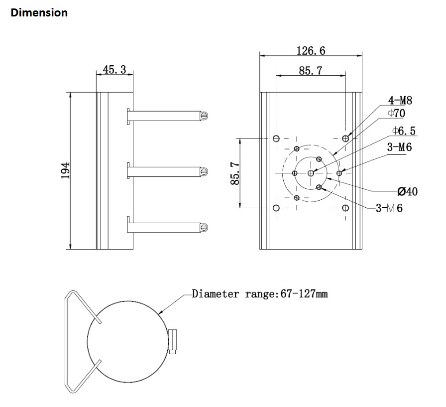 Montážní adaptér instalaci kamer na sloup o průměru 67 až 127mm. Montážní plocha o rozměru 127 mm x 194 mm. Nosnost 10kg. Provedení nerez.
