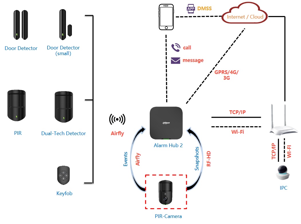 Černá bezdrátová ústředna pro až 150 připojitelných bezdrátových zařízení (64 bezdrátových klíčenek, 6 sirén), venkovní PIR kamera, připojení IP kamer, vybrané domovní zvonky, komunikace s uživateli přes GSM komunikátor dual Single SIM 4G, 3G, 2G a GPRS, možnost 5 čísel pro volání a SMS, Wi-Fi 2,4 GHz nebo ethernet 1x RJ45 10/100M TCP/IP, frekvence 868 MHz s šifrováním AES-128 až 2 000 m.