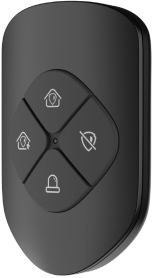 Černá obousměrná bezdrátová klíčenka, 4 naprogramovaná tlačítka - doma, venku, deaktivace alarmu, SOS, LED indikace stavu, obousměrná komunikace 868 MHz a AES-128 šifrování, dosah signálu až 900 m v otevřeném prostoru, napájení: 3V baterie CR2032 (součástí balení), životnost 3 roky.