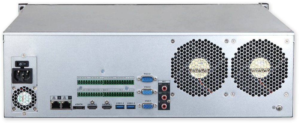 Video výstup: 2 x HDMI 4K (3840 x 2160 px), 2 x VGA FullHD (1920 x 1080 px), maximální počet kamer a rozlišení grafického výstupu (decoding capability) dle datasheetu výrobce